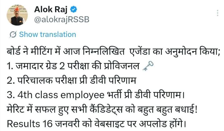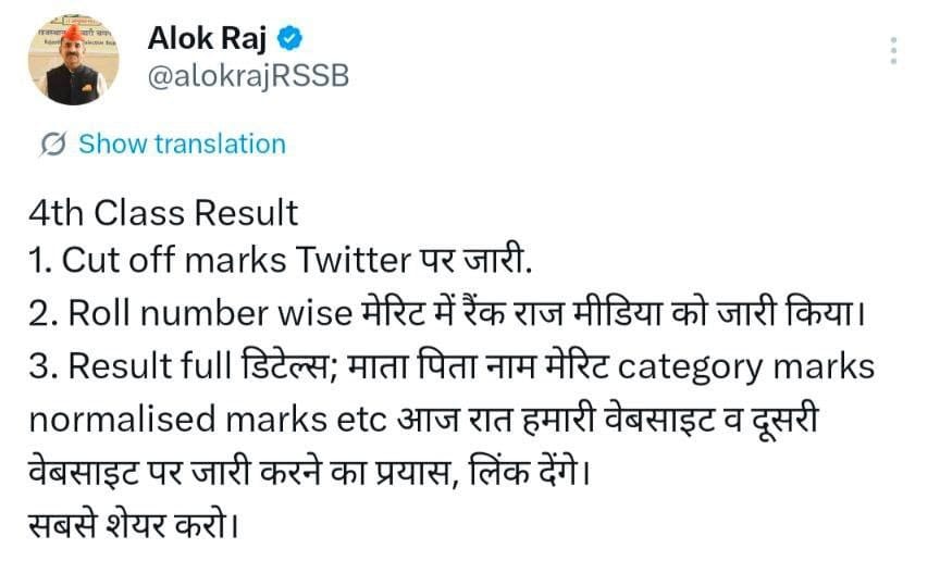As per the latest update shared by RSSB Chairman Shri Alok Raj, the board has announced the Rajasthan Grade 4 Result on 16 January 2026. Candidates can download the Rajasthan 4th Grade Merit List PDF directly from the official website. A direct download link has been provided here for easy access.