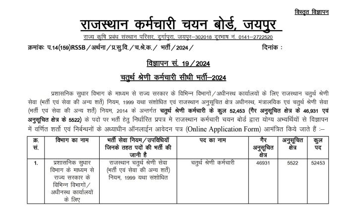 The Rajasthan Staff Selection Board (RSMSSB/RSSB) had earlier announced 52,453 Grade 4 (Group-D) vacancies under Advertisement No. 19/2024, which were later revised and increased to 53,749 vacancies after receiving additional requisitions from departments.