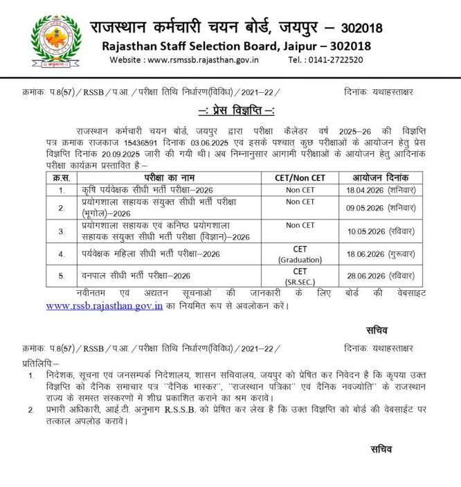 उपरोक्त परीक्षा तिथियाँ आदिनांक (Proposed Schedule) हैं। परीक्षा से संबंधित किसी भी नवीनतम अपडेट, एडमिट कार्ड एवं संशोधन के लिए अभ्यर्थी RSSB की आधिकारिक वेबसाइट www.rssb.rajasthan.gov.in का नियमित रूप से अवलोकन करते रहें।