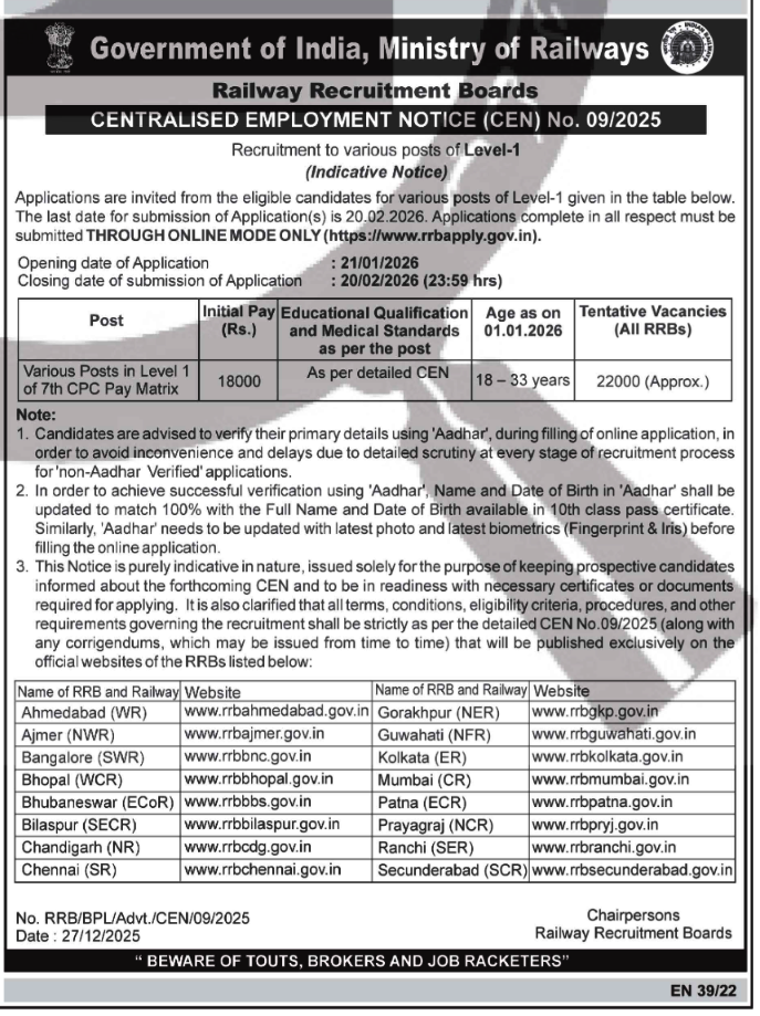 The Railway Recruitment Boards (RRBs) under the Ministry of Railways, Government of India have released an Indicative Centralised Employment Notice (CEN) No. 09/2025 for recruitment to various Level-1 posts across Indian Railways.