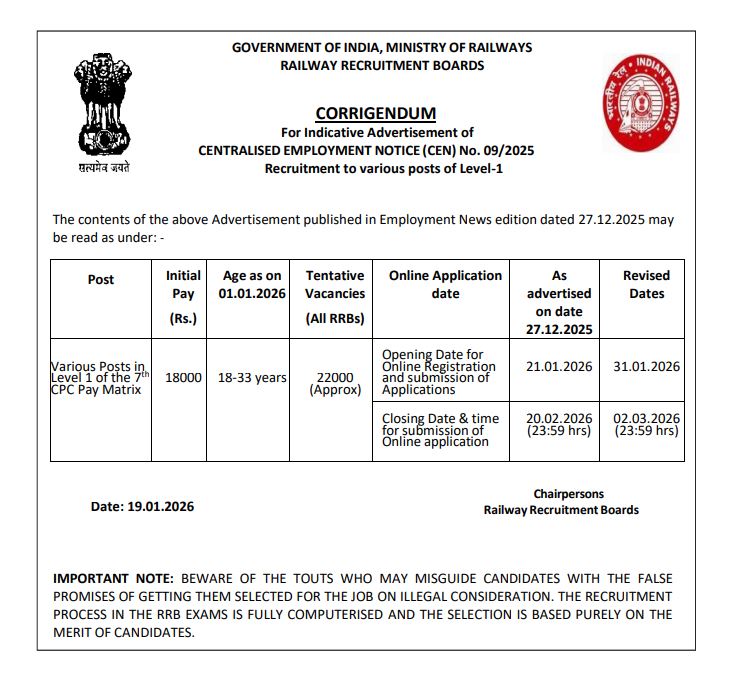 RRB Group D Recruitment 2026 Notification Out | 22,000 Level 1 Vacancies Apply Online, Last Date Extended
