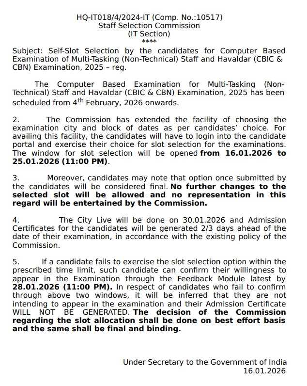The Staff Selection Commission (SSC) has released an important notice regarding Self-Slot Selection for the Computer Based Examination (CBE) of Multi-Tasking (Non-Technical) Staff (MTS) and Havaldar (CBIC & CBN) Examination, 2025.
